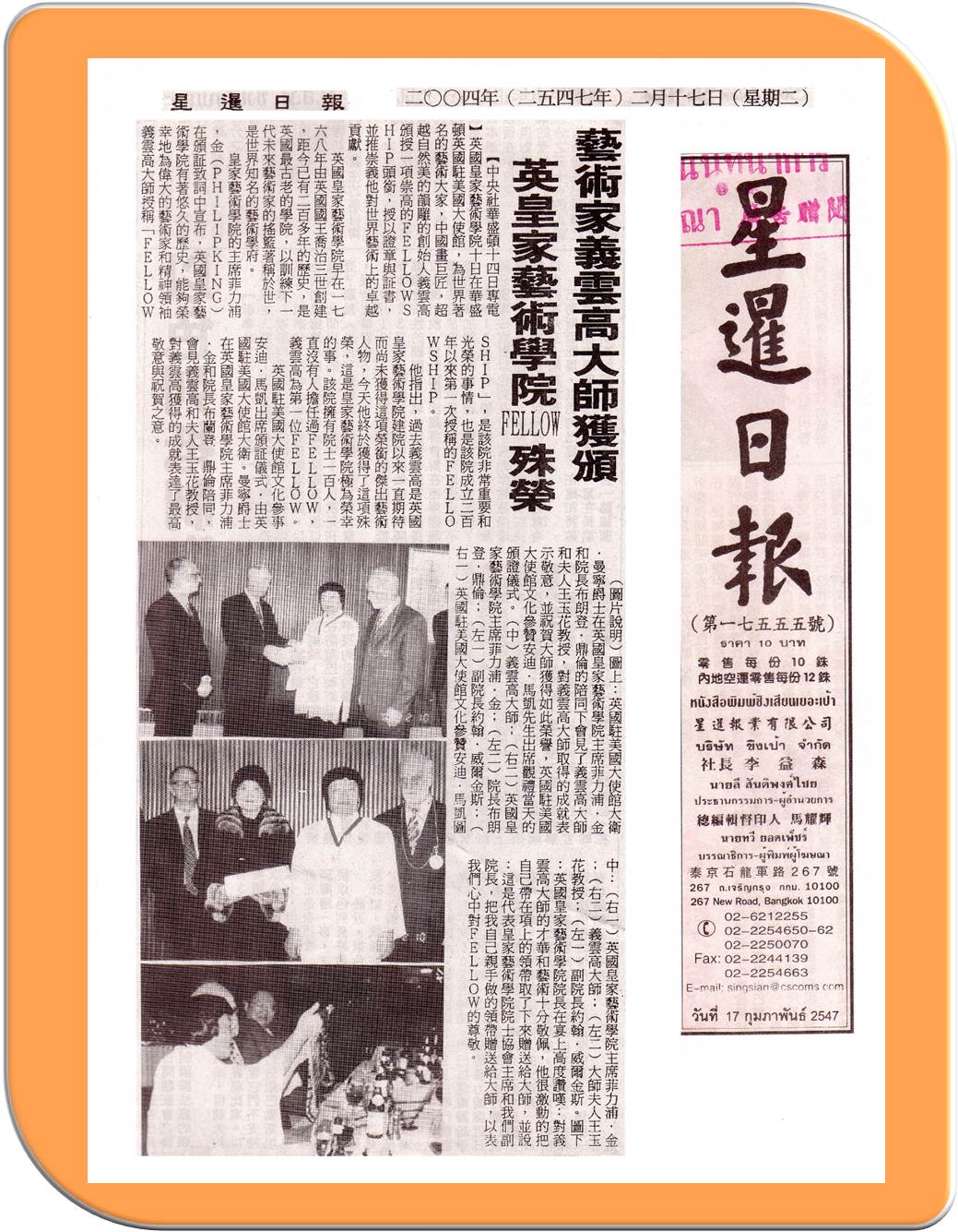 - 2004-02-17星暹日报 艺术家义云高大师获颁 英皇家艺术学院Fellow殊荣