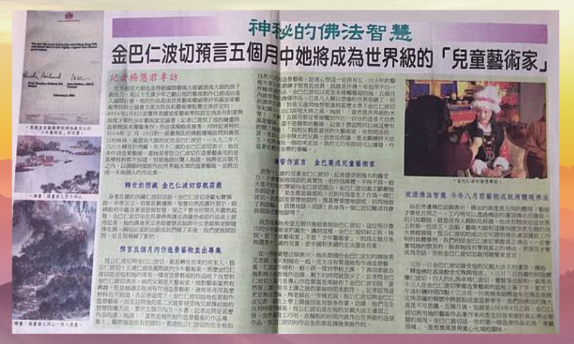 恆公仁波切與金巴仁波切,都是轉世而來的再來人,恆公仁波切十五歲已經是國際級的少年藝術家,那麼金巴仁波切是否也和她的哥哥一樣有造景藝術的作品呢?沒想到金巴仁波切表示,她的父親是大藝術家,她對藝術當然有興趣,但是她過去從沒有作過造景藝術,連他哥哥用甚麼材料也不知道,在記者追問下,金巴仁波切說她也要創作造景藝術,而且訪問後的第二天就要接受她父親傳給她的智慧開膚大法,要在五個月內出一本書,記者追問是甚麼內容的書,她說:「當然是她所創作造景藝術的作品專集!」顯然她是很有把握的。看過恆公仁波切的完全有如自然天成的造景藝術,記者心想一定得有五、六十年的藝術大家功夫鍛鍊才能有此成就,我就是作幾十年也作不出一件極普通作品,金巴仁波切以完全未接觸藝術的她,五個月內就要做出幾個作品,已是凡人難以想像的世界奇蹟了,何況還要出書,於是又追問她想要達到甚麼水準?金巴仁波切年紀雖小,出口卻有大將之風,她說:「當然是世界級的水準!」天啊!五個月要從零接觸到作出一百分的造景大自然風景藝術,還不是簡單的藝術。記者不禁追問何以她這麼有把握?她說:「我的父親是當世的大藝術家,在世間法而言,是我心目中偉大的父親,出世法而論,是金剛總持大法王,他將傳我一個如來正法,我的工巧明即刻可以爆發,作造景是輕而易舉的事嘛。」