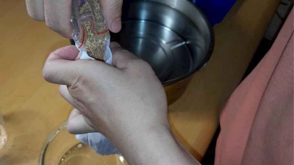 封好愛玉子後放入水中不停的搓揉,你會感覺到果膠慢慢的釋放出來(會有黏滑的感覺喔!),搓揉的時間約7~10分鐘左右(看個人的手速囉!),直到感覺果膠已經都被你搓出為止。
